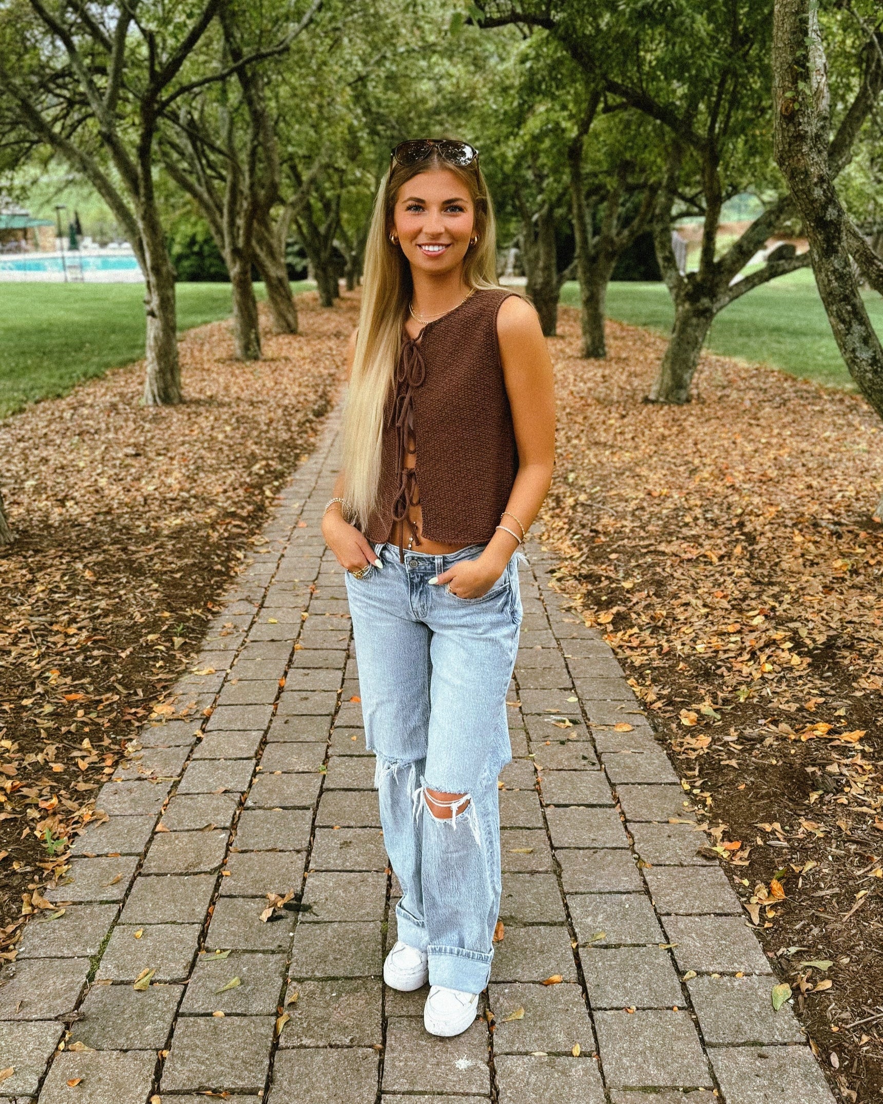 Add a playful twist to your everyday look with the Cocoa Tie-Front Tank. These sleeveless top features a soft, textured fabric with charming front-tie closures that bring a touch of boho flair. The rich brown hue makes it easy to pair with denim, skirts, or layered over dresses, while the breezy cut keeps it comfortable and flattering for warm days. Whether styled casually or dressed up with accessories, this top is the perfect blend of laid-back and chic.